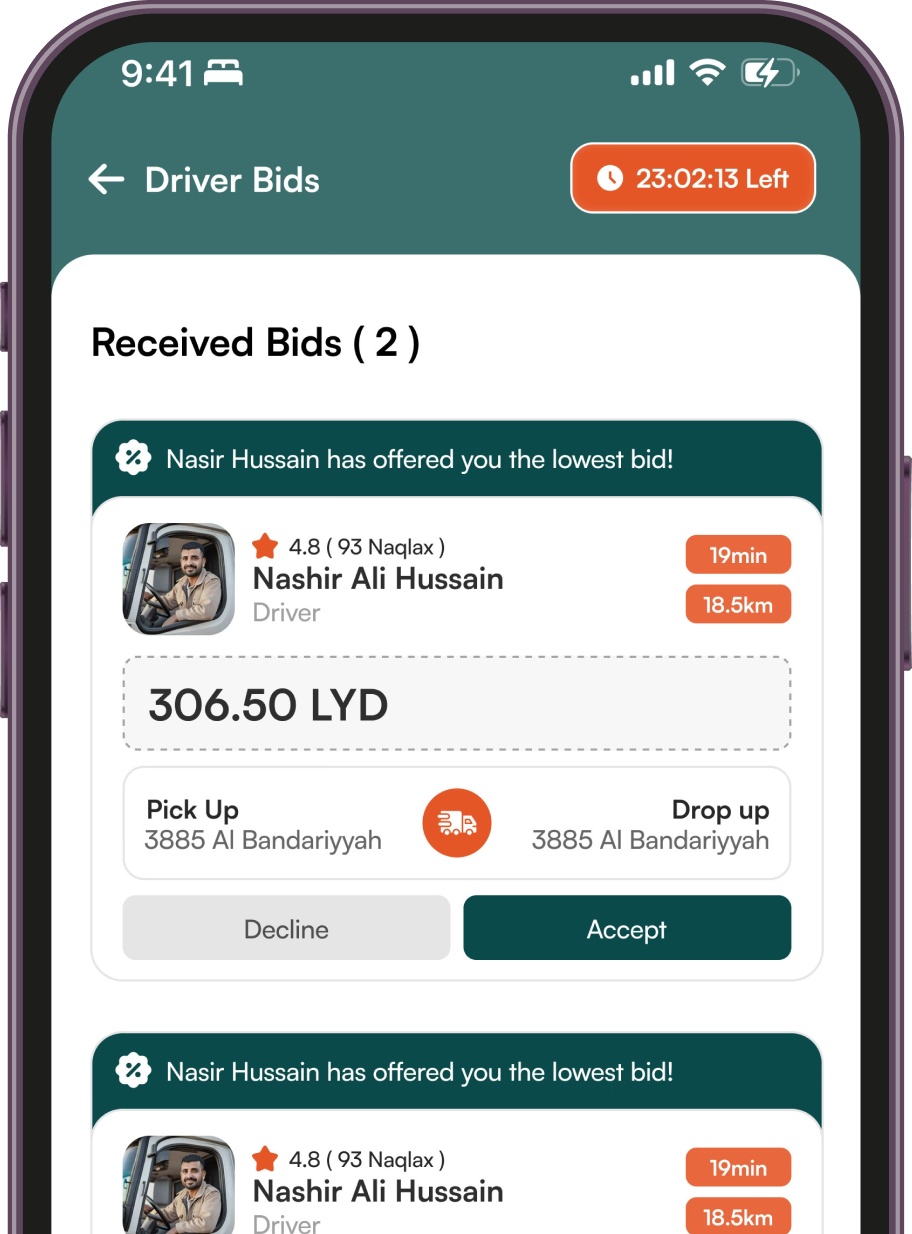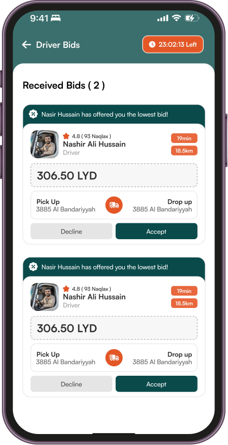 بدل ما تكون مربوط بسائق واحد، تصلك عروض من عدة سائقين، وكل عرض بسعر ووقت وصول مختلف، وانت تختار الأنسب لك.